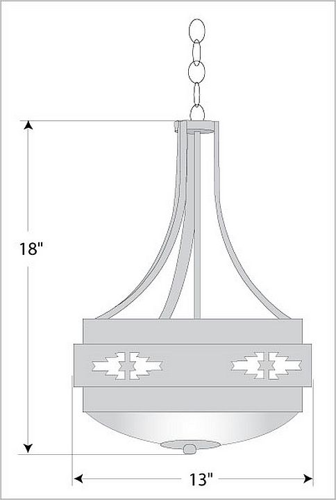 The Northridge Foyer Small - Pueblo fixture features three steel bands arranged on top of one another, the center band with cutouts of Southwest-inspired images going around the circumference of the fixture. Behind each cutout is synthetic mica and a frost white glass bowl is attached in the center. This light is ideal for anyone looking for a small, rustic chandelier to add Southwestern character to their log home, cabin or northwood lodge-themed room. May also be ordered in a compact fluorescent version for an additional charge. A matching ceiling canopy, 3 feet of chain and 10 extra feet of wire are also included.