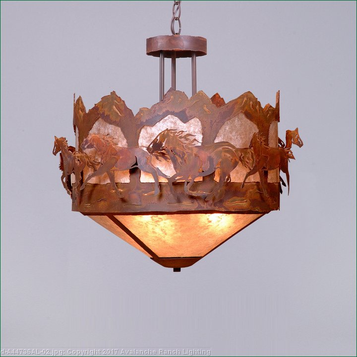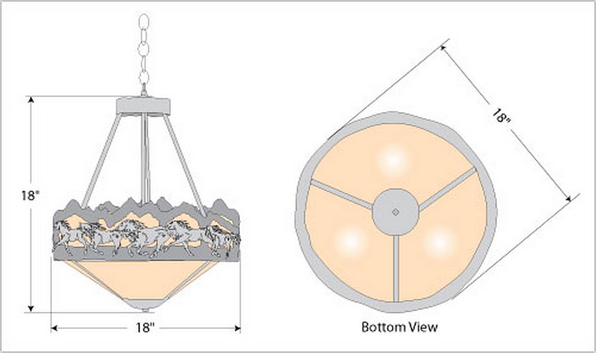 The Crestline Foyer Chandelier Short - Horse/Mtn is 18 inches in diameter by 18 inches tall, and features images of galloping horses and steel mountain silhouettes, backed with diffuser material. The fixture comes with a choice of diffuser material: Almond Mica, Amber Mica, or Ivory Paper. A matching ceiling canopy is also included, along with 3 feet of chain and 10 extra feet of wire. This chandelier will add a touch of western wildlife and rustic character to any log home, cabin or northwood lodge-themed room.