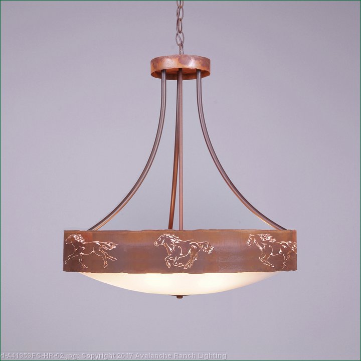 The Ridgemont Chandelier Small - Horse Cutout is 24 inches in diameter and features our exclusive horse cutout around the steel band. Behind each cutout is a diffuser panel. This rustic chandelier comes with the choice of either a frosted glass bowl (FC) or a tea-stained glass bowl (TS). A matching ceiling canopy is also included, along with 3 feet of chain and 10 extra feet of wire. This chandelier will add a rustic, western character to any log home, cabin or northwood lodge-themed room.