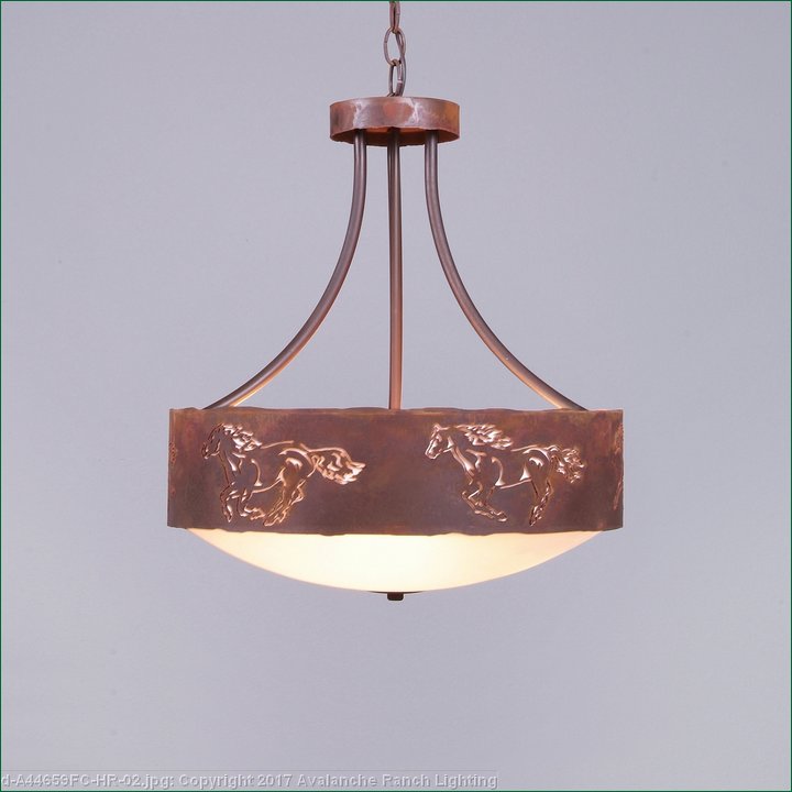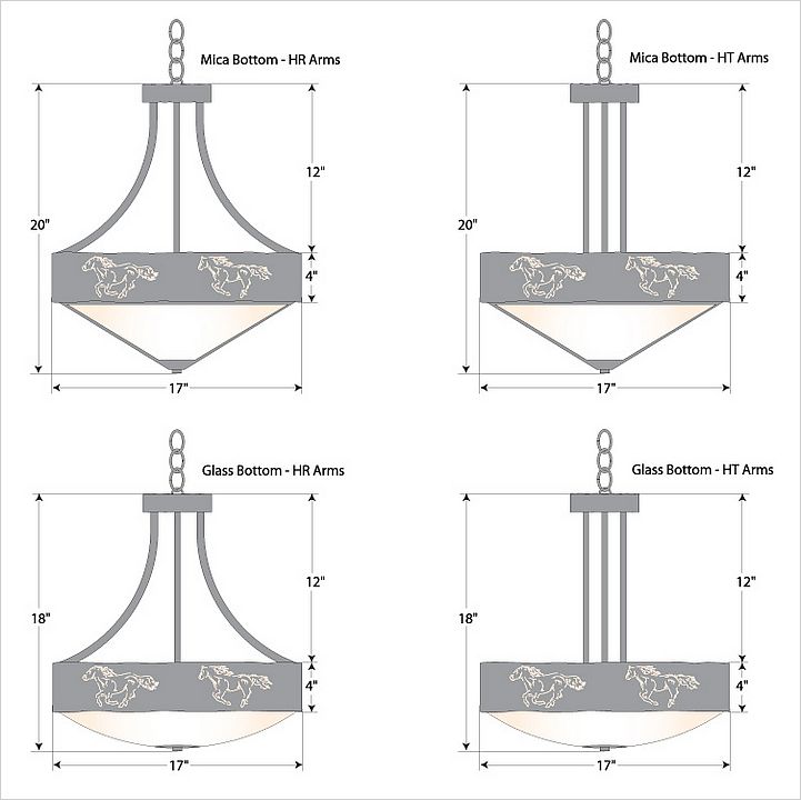 The Ridgemont Foyer Chandelier Large Short -Glass Bottom- Horse Cutout is 17 inches in diameter by 17 inches tall, and features our exclusive horse cutouts around the steel band. Behind each cutout is a diffuser panel. This small chandelier comes with the choice of either a frosted glass bowl (FC) or a tea-stained glass bowl (TS). A matching ceiling canopy is also included, along with 3 feet of chain and 10 extra feet of wire. This chandelier will add a rustic, western character to the entryway of any log home, cabin or northwood lodge-themed room.
