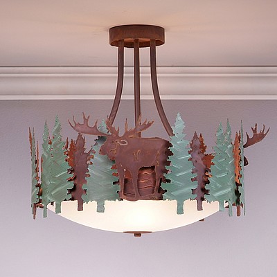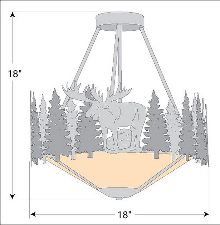 The Crestline Semi-Flush Tall - Moose is 18 inches in diameter by 16 inches tall, and features our exclusive moose images nestled among the hand-painted pine trees. This rustic semi-flush comes with the choice of either a frosted glass bowl (FC) or a tea-stained glass bowl (TS). A matching ceiling canopy is also included. This forest-inspired semi-flush will add a rustic, northwoods character to the hallways, kitchens or bathroom of their log home, cabin or northwood lodge-themed room.