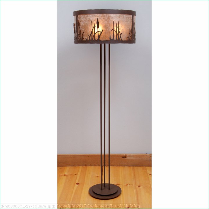 The Kincaid Drum Floor Lamp - Cattails features our exclusive cattails metal art in three sections and all around the drum lampshade. The lampshade measures 19 inches in diameter by 9.5 inches tall, is made of heavy gauge steel and inside has a mica diffuser with a choice of either Almond or Amber. It has a simple stand with a round base and three molded vinyl feet on the bottom to protect the surface of the Floor and a dimmer switch. This rustic Floor lamp will bring a rustic decorative look and lighting to any log home, cabin or northwood lodge-themed room.