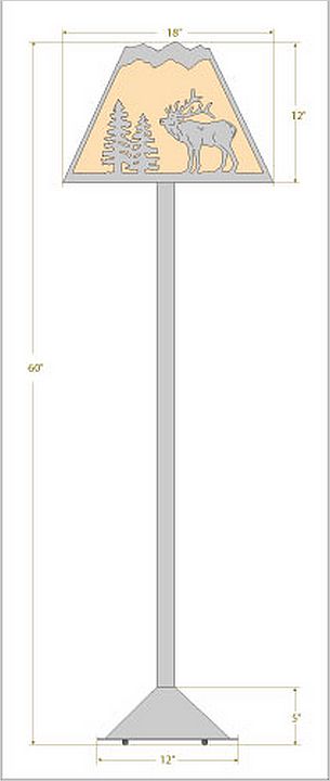 The Rocky Mtn Floor Lamp - Mtn Elk features an 18in. wide by 12in. tall lampshade frame with our exclusive elk metal artwork on the front two panels, and spruce trees on the sides. The lamp is made of heavy gauge steel, and has a diffuser choice between Almond or Amber mica. The light features a simple stand with a square base, four molded vinyl feet on the bottom to protect the floor's surface, and a three-way switch built into the socket. In order to protect the pieces from damage during shipment, minor assembly of the lamp is required; this consists of inserting the pole into the base, and tightening the two bolts. This floor lamp will bring rustic, decorative lighting to any log home, cabin or northwood lodge-themed room.