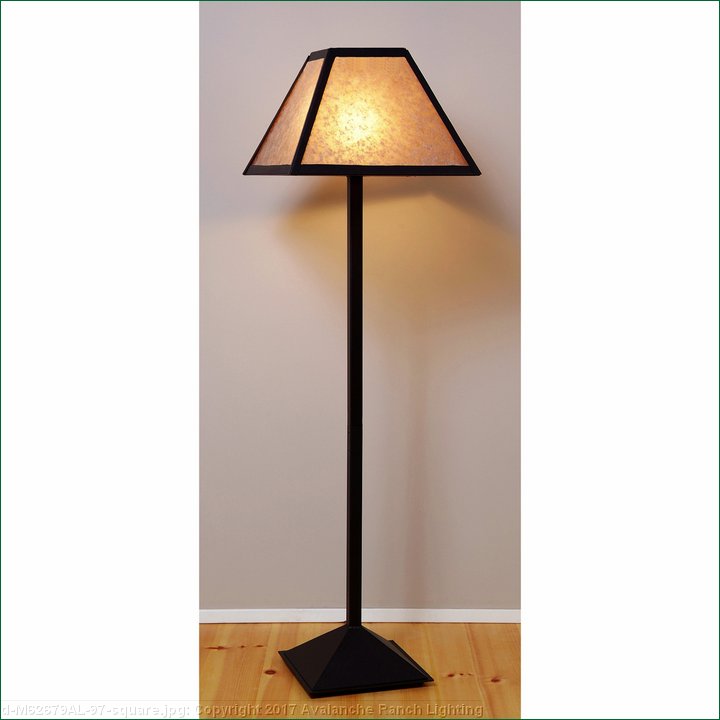 The Rocky Mtn Floor Lamp - Northrim features an 18in. wide by 12in. tall lampshade frame with straight edges. The lamp is made of heavy gauge steel, and has a diffuser choice between Almond or Amber mica. The light features a simple stand with a square base, four molded vinyl feet on the bottom to protect the floor's surface, and a three-way switch built into the socket. In order to protect the pieces from damage during shipment, minor assembly of the lamp is required; this consists of inserting the pole into the base, and tightening the two bolts. This mission-styled floor lamp will bring warm character to any cottage, craftsman-styled room, or traditional home.