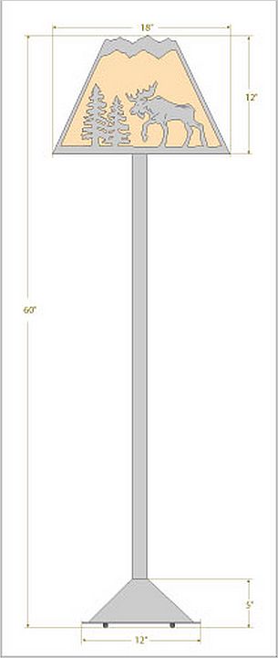 The Rocky Mtn Floor Lamp - Mtn Moose features an 18in. wide by 12in. tall lampshade frame with our exclusive moose metal artwork on the front two panels, and spruce trees on the sides. The lamp is made of heavy gauge steel, and has a diffuser choice between Almond or Amber mica. The light features a simple stand with a square base, four molded vinyl feet on the bottom to protect the floor's surface, and a three-way switch built into the socket. In order to protect the pieces from damage during shipment, minor assembly of the lamp is required; this consists of inserting the pole into the base, and tightening the two bolts. This floor lamp will bring rustic, decorative lighting to any log home, cabin or northwood lodge-themed room.