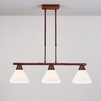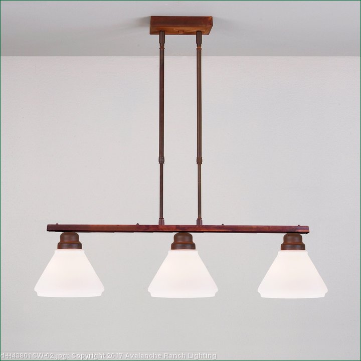 The Cedarwood Triple Island/Bar Light - Rustic Plain fixture features three bulbs, adjustable height stems and a choice of two different styles of cone glass. Included with the fixture is 10 feet of wire and two telescoping stems that have a 12 inch adjustment range from 15 to 27 inches. For longer adjustments up to 138 inches, order one or more of the extension kits. A matching 5 by 6 inch ceiling canopy is also included. To add extensions to stem length, use accessory kits for double stem fixtures PK460. For vaulted ceilings, use accessory Kit CK422
