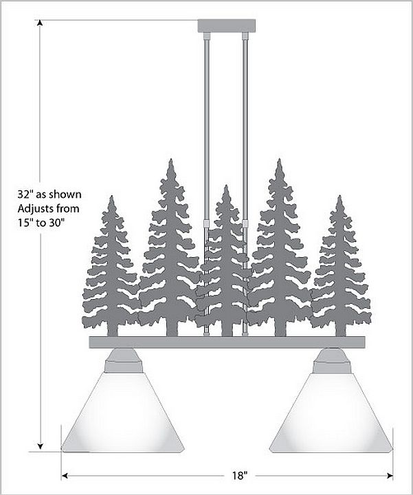The Cedarwood Double Island/Bar Light - Cedar Tree fixture features two bulbs, adjustable height stems and a choice of two different styles of cone glass. Included with the fixture is 10 feet of wire and two telescoping stems that have a 12 inch adjustment range from 15 to 27 inches. For longer adjustments up to 138 inches, order one or more of the extension kits. A matching 5 by 6 inch ceiling canopy is also included. To add extensions to stem length, use accessory kits for double stem fixtures PK460. For vaulted ceilings, use accessory Kit CK422