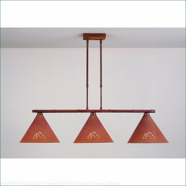 This Canyon Island/Billiard Medium - Mtn/Pine provides direct lighting for a kitchen island, eating bar, billiard table or similar locations where a direct light is desired. Included with the fixture is 10 feet of wire and two telescoping stems that have an adjustment range of 15 to 30 inches. For longer stem lengths (up to 138 inches), order one or more of the extension kits. A matching 5 x 10 inch ceiling canopy is also included.