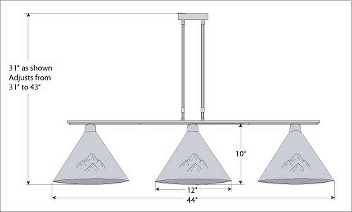 This Canyon Island/Billiard Medium - Mountain provides direct lighting for a kitchen island, eating bar, billiard table or similar locations where a direct light is desired. Included with the fixture is 10 feet of wire and two telescoping stems that have an adjustment range of 15 to 30 inches. For longer stem lengths (up to 138 inches), order one or more of the extension kits. A matching 5 x 10 inch ceiling canopy is also included.