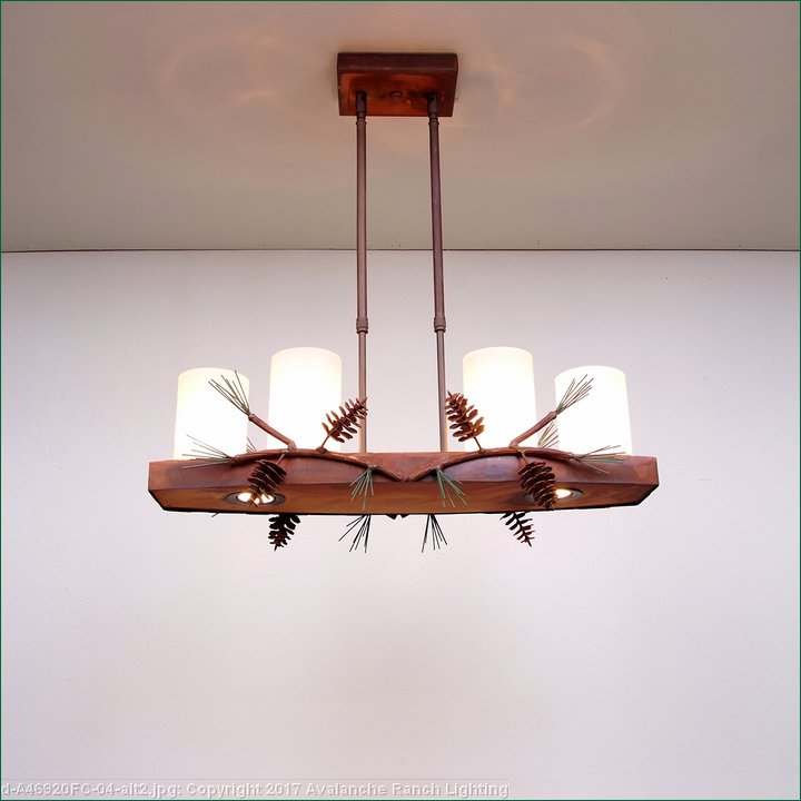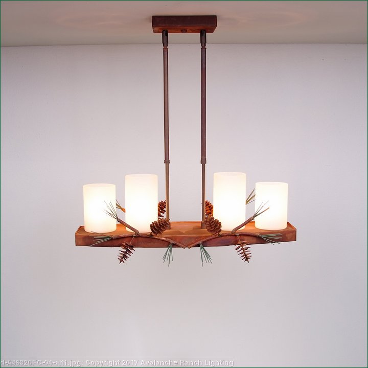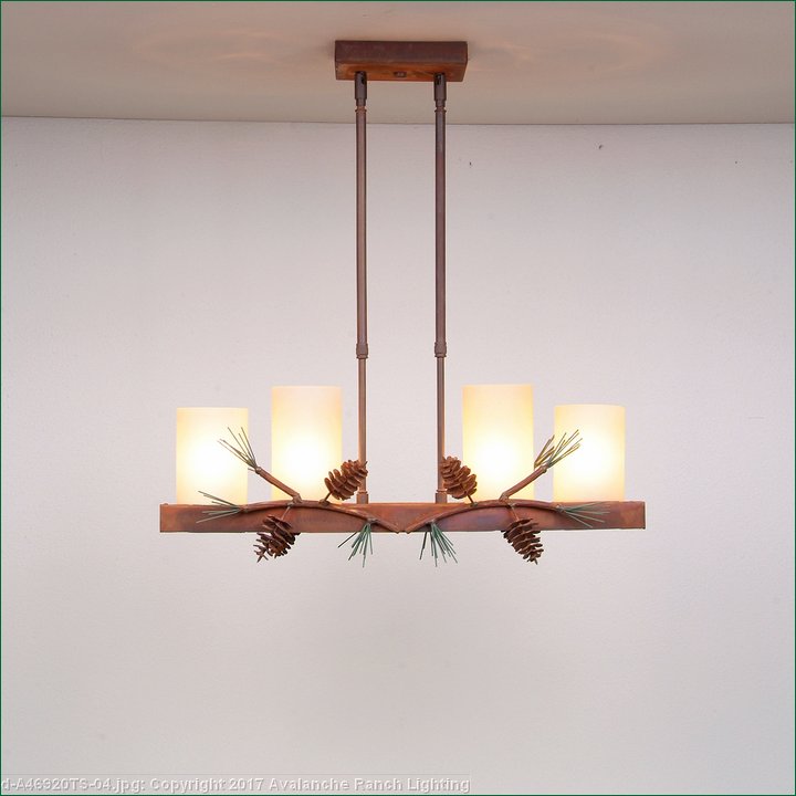 Our Wisley Island Light is fantastic addition to our line, as it brings together our favorite elements: rustic contemporary in its simpicity. Four candelabra bulbs with a glass cover for a bright lighting solution, plus three low voltage halogen lights for downlights (which are on a separate switch -you can choose uplights on only, downlights on only or all lights on.) The 3 inch diameter cylinders are offered in a choice of color- frost clear or frost tea-stained. This light is also a compact size, it can fit over a kitchen island or bar for dramatic lighting, or over a eating nook, or in a dining room where space may be a premium. The double stems are adjustable, for a range of 15 inches to 30 inches as the standard. For a taller ceiling, order one of the double stem extension kits. For further customization, choose between a straight or wavy cut edge detail. This model features pine cone and branch adornments along the bottom edge. Any way you customize it, this light is a perfect fit for any log home or other rustic-style dwelling.