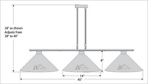 This Canyon Island/Billiard Shallow - Mtn/Pine provides direct lighting for a kitchen island, eating bar, billiard table or similar locations where a direct light is desired. Included with the fixture is 10 feet of wire and two telescoping stems that have an adjustment range of 15 to 30 inches. For longer stem lengths (up to 138 inches), order one or more of the extension kits. A matching 5 x 10 inch ceiling canopy is also included.