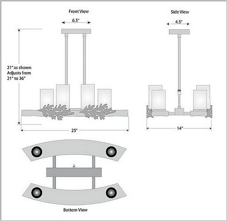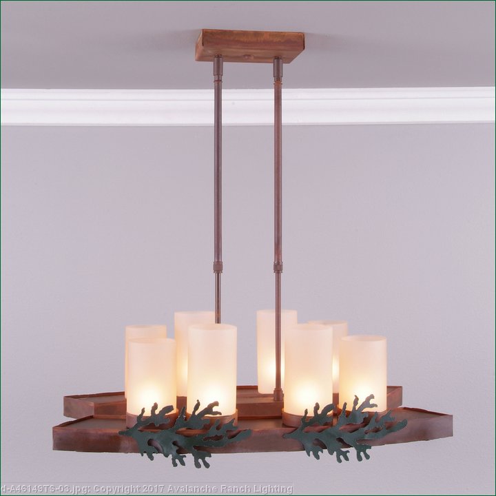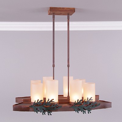 Our Wisley Kithchen Nook Light is fantastic addition to our line, as it brings together our favorite elements: rustic contemporary in its simpicity, eight candelabra bulbs with a glass cover for a bright lighting solution, plus six, low voltage halogen lights for downlights (which are on a separate switch -you can choose uplights on only, downlights on only or all lights on.) The 3 inch diameter cylinders are offered in a choice of color between frost clear and frost tea-stained. This lights is also a compact size, that can fit over a Kitchen Nook, Island or bar for dramatic lighting, or over a eating nook, or in a dining room where space may be a premium. The double stems are adjustable, for a range of 15 inches to 30 inches as the standard. For a taller ceiling, order one of the double stem extension kits. This is the Cedar Bought version of this light, which features handcut maple leaves attached to wavy bands on each side. A perfect fit for a log home in rust patina.