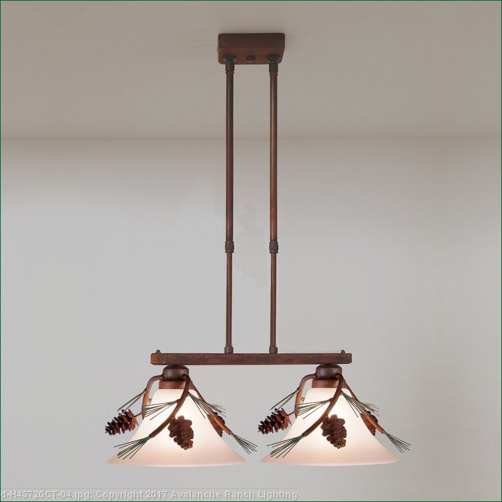 The Cedarwood Double Island/Bar Light - Pine Cone fixture features two bulbs, adjustable height stems and a choice of two different styles of cone glass. Surrounding each piece of glass is our exclusive three dimensional pine cone artwork. Included with the fixture is 10 feet of wire and two telescoping stems that have a 12 inch adjustment range from 15 to 27 inches. For longer adjustments up to 138 inches, order one or more of the extension kits. A matching 5 by 6 inch ceiling canopy is also included. To add extensions to stem length, use accessory kits for double stem fixtures PK460. For vaulted ceilings, use accessory Kit CK422
