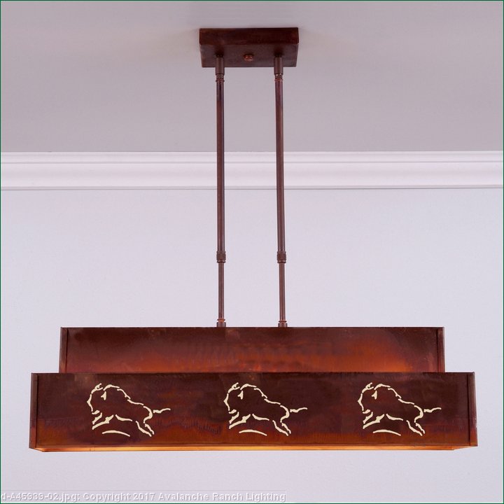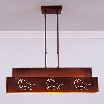Our Northridge Island/Bar - Bison features our exclusive southwest inspired bison cutouts and provides direct lighting for a kitchen island, eating bar or similar locations where a direct light is desired over a narrow space. Behind each cutout is a acrylic diffuser and covering each bulb is a square piece of frosted glass. Included with the fixture is 10 feet of wire and two telescoping stems that have an adjustment range of 15 to 30 inches. For longer stem lengths (up to 138 inches), order one or more of the extension kits. A matching 5 x 10 inch ceiling canopy is also included. This Southwest inspired island fixture has clean lines and a very relaxing rustic feel.
