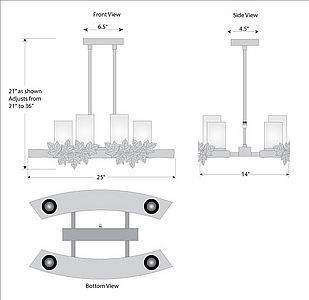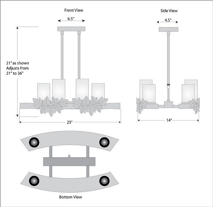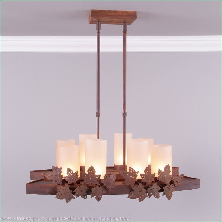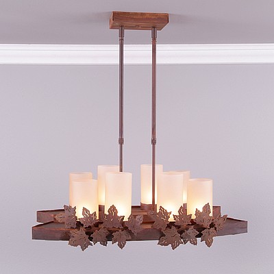 Our Wisley Kithchen Nook Light is fantastic addition to our line, as it brings together our favorite elements: rustic contemporary in its simpicity, eight candelabra bulbs with a glass cover for a bright lighting solution, plus six, low voltage halogen lights for downlights (which are on a separate switch -you can choose uplights on only, downlights on only or all lights on.) The 3 inch diameter cylinders are offered in a choice of color between frost clear and frost tea-stained. This lights is also a compact size, that can fit over a Kitchen Nook, Island or bar for dramatic lighting, or over a eating nook, or in a dining room where space may be a premium. The double stems are adjustable, for a range of 15 inches to 30 inches as the standard. For a taller ceiling, order one of the double stem extension kits. This is the Maple Leaf version of this light, which features handcut metal maple leaves attached to wavy bands on each side. A perfect fit for a log home in rust patina.
