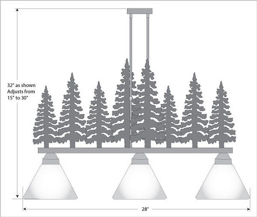 The Cedarwood Trible Island/Bar Light - Cedar Tree fixture features three bulbs, adjustable height stems and a choice of two different styles of cone glass. Included with the fixture is 10 feet of wire and two telescoping stems that have a 12 inch adjustment range from 15 to 27 inches. For longer adjustments up to 138 inches, order one or more of the extension kits. A matching 5in by 10in ceiling canopy is also included. To add extensions to stem length, use accessory kits for double stem fixtures PK460. For vaulted ceilings, use accessory Kit CK422