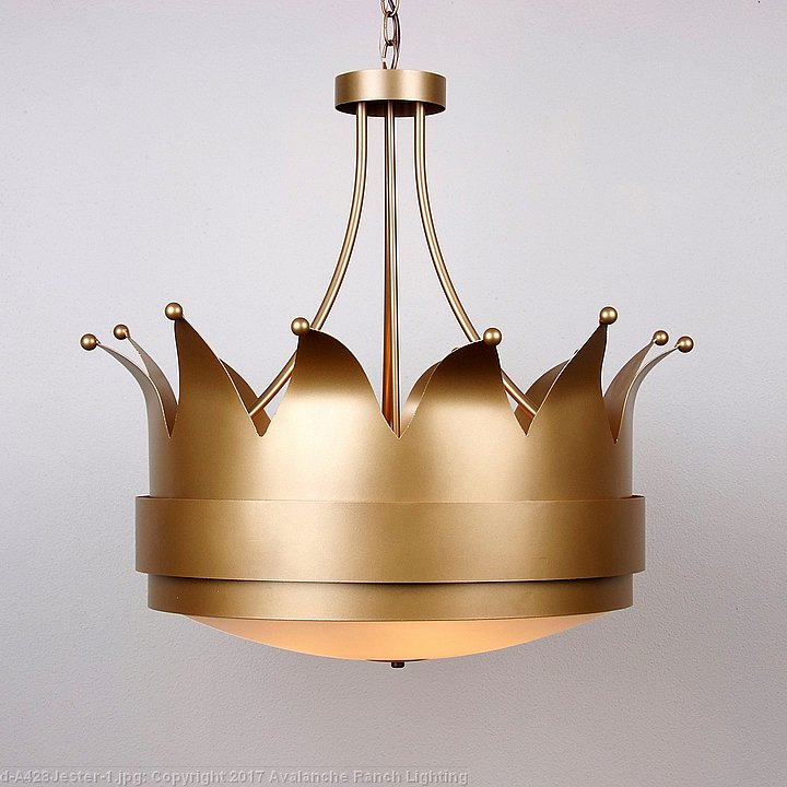 The Northridge Chandelier Small - Jester custom chandelier features three steel bands arranged on top of one another, with a glass bowl underneath. On the top band, we created custom artwork to make it look like the court jester from medievel times, including the bells on the tip of each point!