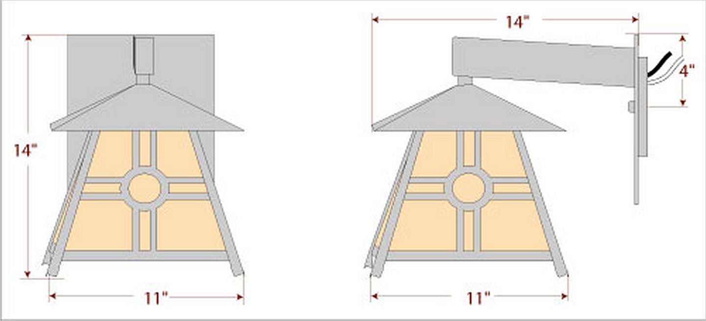The Smoky Mtn Sconce Large - Southview fixture is UL-rated for indoor and outdoor locations. Our exclusive mission-style artwork is displayed on all four panels. The fixture has a steel frame, and comes with a diffuser material choice between Almond or Amber mica. The sconce is hardwire only, and attaches to the wall with a 4.5 inch square pan. This craftsman-styled sconce will bring warm lighting and character to any cottage, home, or mission-styled room.