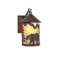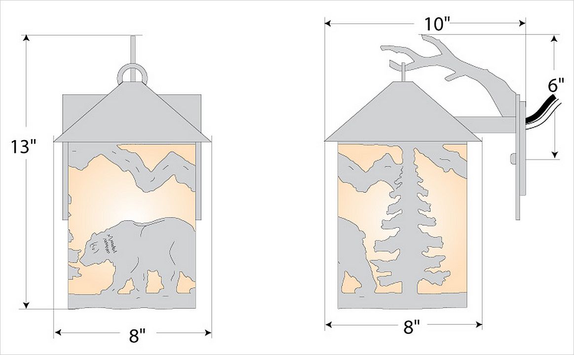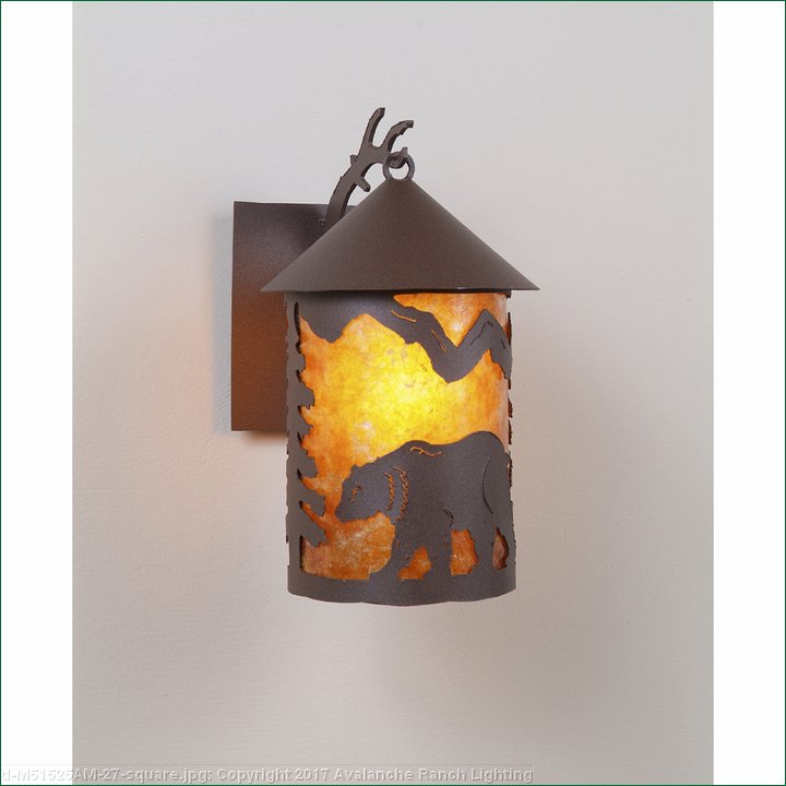 The Cascade Lantern Sconce Medium - Bear features a steel branch holding up a 6 inch round cylinder with a cone top and a shade diffuser choice of color between Almond or Amber mica. Our exclusive bear metal art is on the front and spruce trees are on either side of the cylinder. Attaches to wall with a 4.5 inch square pan. Hardwire only. Suitable for interior and exterior locations. This rustic wall light is ideal for bringing rustic lighting to any log home, cabin or northwood-themed room.