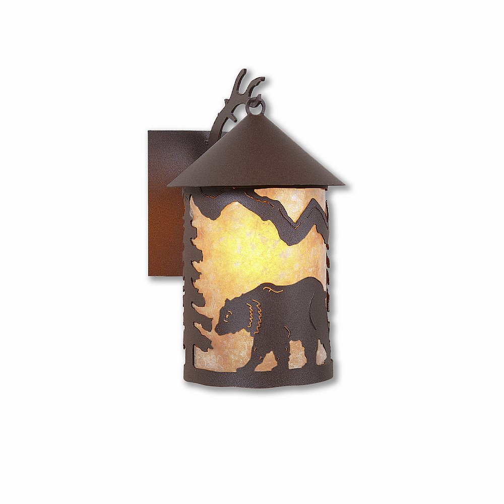 The Cascade Lantern Sconce Medium - Bear features a steel branch holding up a 6 inch round cylinder with a cone top and a shade diffuser choice of color between Almond or Amber mica. Our exclusive bear metal art is on the front and spruce trees are on either side of the cylinder. Attaches to wall with a 4.5 inch square pan. Hardwire only. Suitable for interior and exterior locations. This rustic wall light is ideal for bringing rustic lighting to any log home, cabin or northwood-themed room.