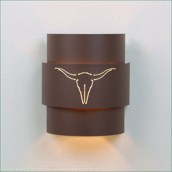 The Northridge Sconce Small - Longhorn Cutout features a steel frame with our exclusive longhorn artwork in the center band. The fixture includes one bulb pointing upward and another downward, and a tall glass cylinder to cover the lightbulbs. An acrylic lens also covers the cutout. This unique sconce will provide unique interior or exterior rustic lighting for any log home, cabin or northwood lodge-themed room. Hardwire only. Note: Only powdercoated finishes are recommended for exterior locations.