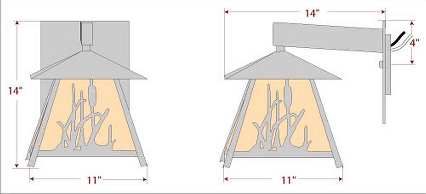 The Smoky Mtn Sconce Large - Cattails fixture is UL-rated for indoor and outdoor locations. Our cattail artwork is displayed on all four panels. The fixture has a steel frame, and comes with a diffuser material choice between Almond or Amber mica. The sconce is hardwire only, and attaches to the wall with a 4.5 inch square pan. This light will bring rustic character to any log home, cabin or northwood lodge-themed room.