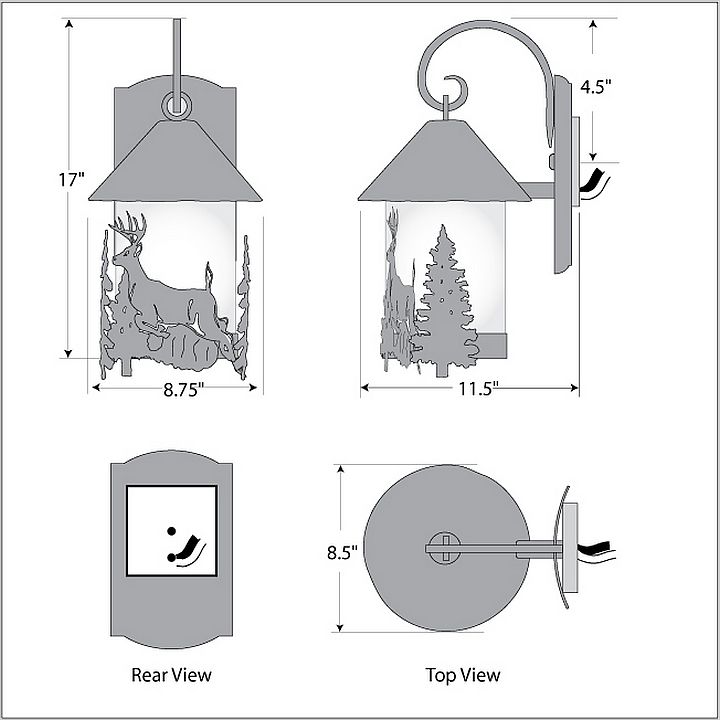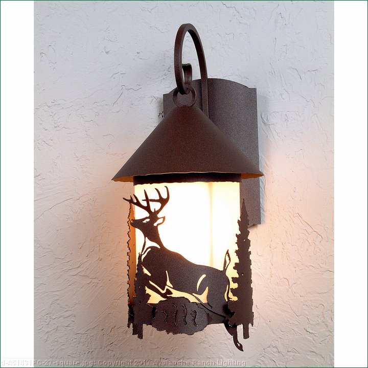 The Vista Lantern Sconce - Deer features an 8 inch tall by 6 inch diameter frosted cylinder glass surrounded by the metal art images of a deer and trees. This exterior sconce is perfect for anyone looking to bring a touch of rustic wildlife to the outside entrances of their log home, cabin or northwood lodge-themed room. Mounts to a minimum 5 inch square board or wall area. UL approved for Wet Locations.