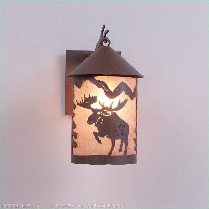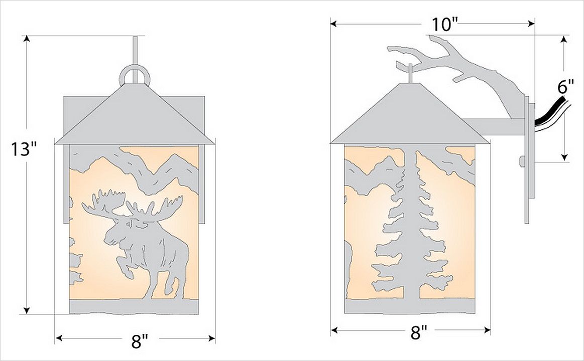 The Cascade Lantern Sconce Medium - Alaska Moose features a steel branch holding up a 6 inch round cylinder with a cone top and a shade diffuser choice of color between Almond or Amber mica. Our exclusive moose metal art is on the front and spruce trees are on either side of the cylinder. Attaches to wall with a 4.5 inch square pan. Hardwire only. Suitable for interior and exterior locations. This rustic wall light is ideal for bringing rustic lighting to any log home, cabin or northwood-themed room.