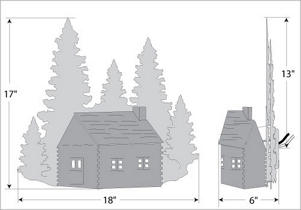 The Cozy Log Cabin Exterior light features pine trees set behind the cabin. It is UL approved for wet locations. This item comes with a frosted glass cylinder which covers the bulb. The light source, which gives the effect of a warm log cabin lit from within, points downward. This rustic light is ideal for anyone looking to bring warm, rustic character to the outside lighting of their home. Mounts to a minimum 5 inch square board. Available only in powder-coated finish options.