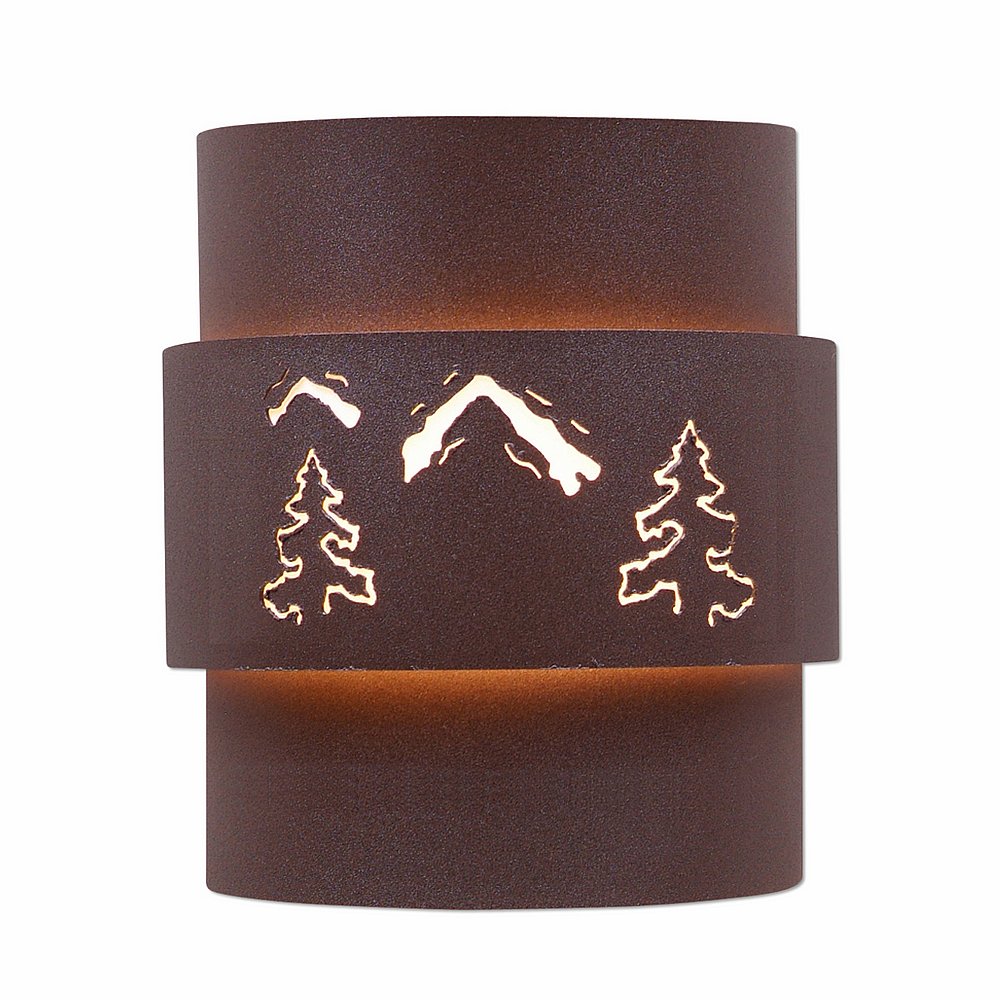 The Northridge Sconce Large - Mountain/Pine features a steel frame with our exclusive mountain and pine tree artwork in the center band. The fixture includes one bulb pointing upward and another downward, and a tall glass cylinder to cover the lightbulbs. An acrylic lens also covers the cutout. This Southwest-inspired sconce will provide unique interior or exterior rustic lighting for any log home, cabin or northwood lodge-themed room. Hardwire only. Note: Only powdercoated finishes are recommended for exterior locations.