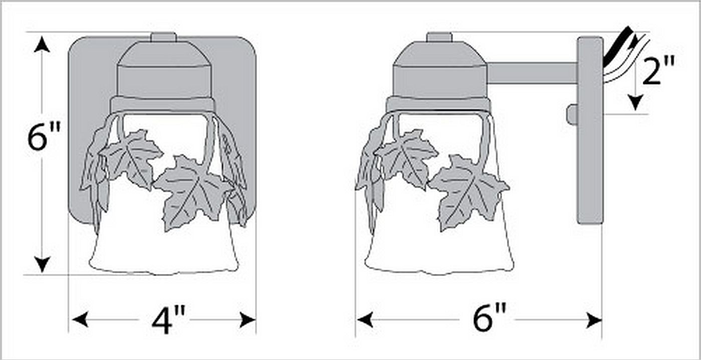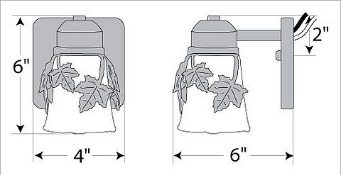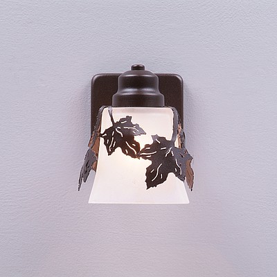 The Woodland Single Sconce - Maple Leaf features square mission style glass and simple leaf designs surrounding the glass. The maple leaves have hand-cut interior lines which gives each image a unique look. Choice of glass color between Frosted and Tea-Stained. This sophisticated yet rustic looking sconce will had a touch of stylish lighting to the exterior of any log home, cabin or northwood lodge-themed room. Mounting plate measures 4.5 inches square. Note: For wet locations, the glass may face down only and only the powdercoated finishes are recommended.