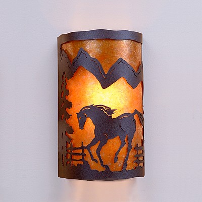 The Cascade Exterior Sconce - Mtn Horse features twin lightbulbs, one pointing down and one pointing up, and surrounded by a 10 inch tall frost glass cylinder behind the mica and a 5 x 9 inch backplate, which can be mounted directly to an exterior wall or attached to a square wooden block. This fixture is offered with a shade diffuser choice of either Almond or Amber mica. UL approved for wet locations. Hardwire only. This is the exterior version of our very popular Cascade Sconce series M133 and is ideal for bringing rustic lighting to the exterior of any log home or cabin.