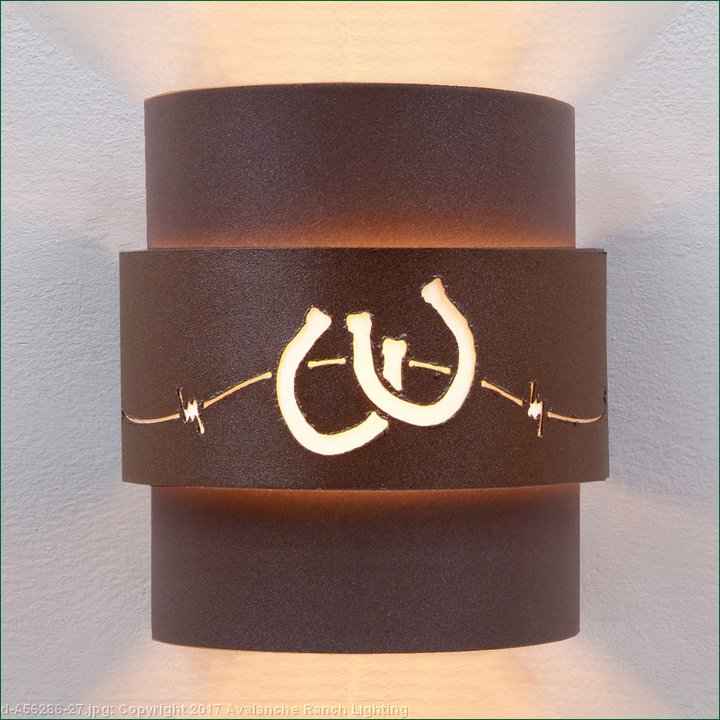 The Northridge Sconce Large - Barbed Wire and Horseshoe Cutout features a steel frame with our exclusive western-styled artwork in the center band. The fixture includes one bulb pointing upward and another downward, and a tall glass cylinder to cover the lightbulbs. An acrylic lens also covers the cutout. This Southwest-inspired sconce will provide unique interior or exterior rustic lighting for any log home, cabin or northwood lodge-themed room. Hardwire only. Note: Only powdercoated finishes are recommended for exterior locations.