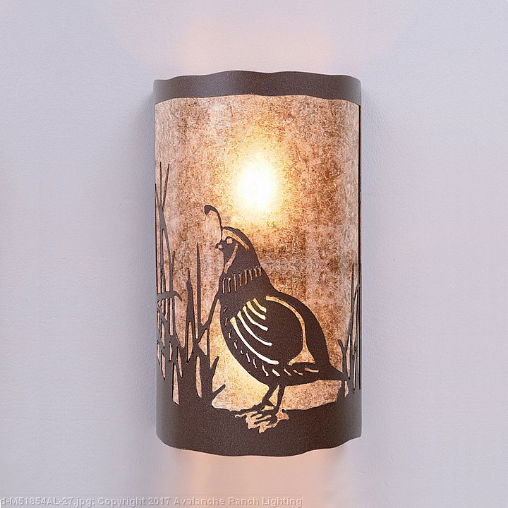 The Cascade Exterior Sconce - Quail features twin lightbulbs, one pointing down and one pointing up, and surrounded by a 10 inch tall frost glass cylinder behind the mica and a 5 x 9 inch backplate, which can be mounted directly to an exterior wall or attached to a square wooden block. This fixture is offered with a shade diffuser choice of either Almond or Amber mica. UL approved for wet locations. Hardwire only. This is the exterior version of our very popular Cascade Sconce series M133 and is ideal for bringing rustic lighting to the exterior of any log home or cabin.