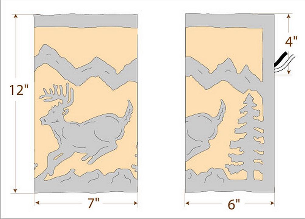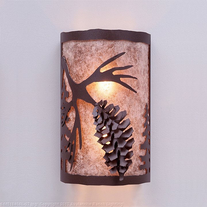 The Cascade Exterior Sconce - Spruce Cone features twin lightbulbs, one pointing down and one pointing up, and surrounded by a 10 inch tall frost glass cylinder behind the mica and a 5 x 9 inch backplate, which can be mounted directly to an exterior wall or attached to a square wooden block. This fixture is offered with a shade diffuser choice of either Almond or Amber mica. UL approved for wet locations. Hardwire only. This is the exterior version of our very popular Cascade Sconce series M133 and is ideal for bringing rustic lighting to the exterior of any log home or cabin.