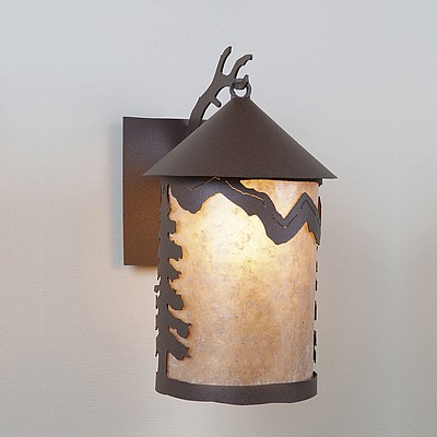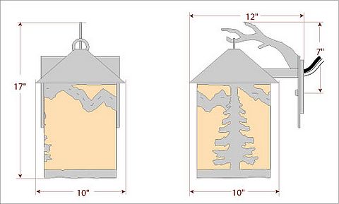 The Cascade Lantern Sconce Large - Rustic Plain features a steel branch holding up a 8 inch round cylinder with a cone top and a shade diffuser choice of color between Almond or Amber mica. Mountains are on the front and spruce trees are on either side of the cylinder. Attaches to wall with a 4.5 inch square pan. Hardwire only. Suitable for interior and exterior locations. This rustic wall light is ideal for bringing rustic lighting to any log home, cabin or northwood-themed room.