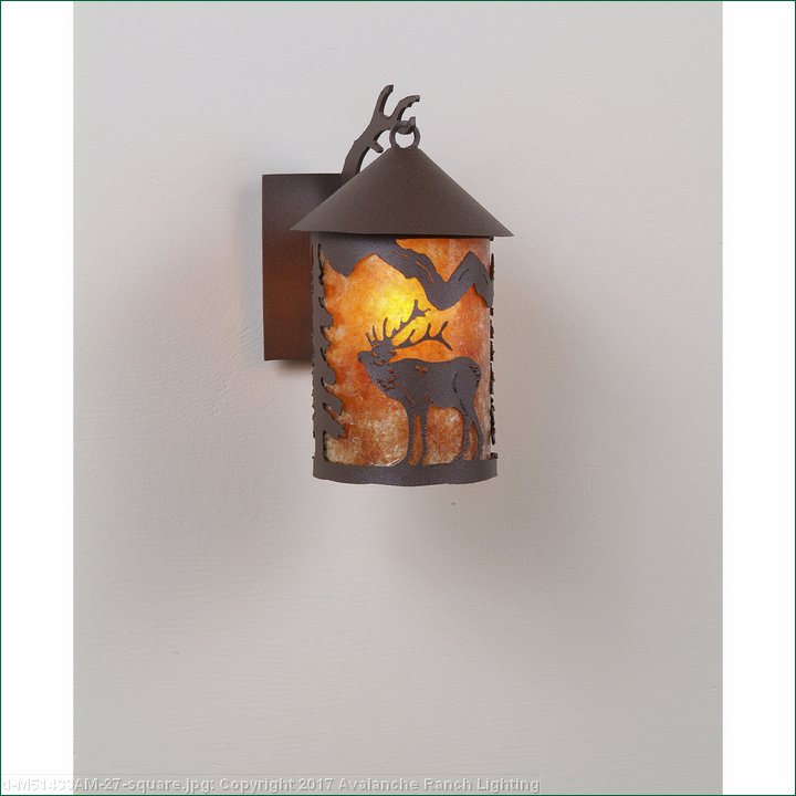 The Cascade Lantern Sconce Small - Mtn Elk features a steel branch holding up a 4 inch round cylinder with a cone top and a shade diffuser choice of color between Almond or Amber mica. Our exclusive elk metal art is on the front and spruce trees are on either side of the cylinder. Attaches to wall with a 4.5 inch square pan. Hardwire only. Suitable for interior and exterior locations. This rustic wall light is ideal for bringing rustic lighting to any log home, cabin or northwood-themed room.
