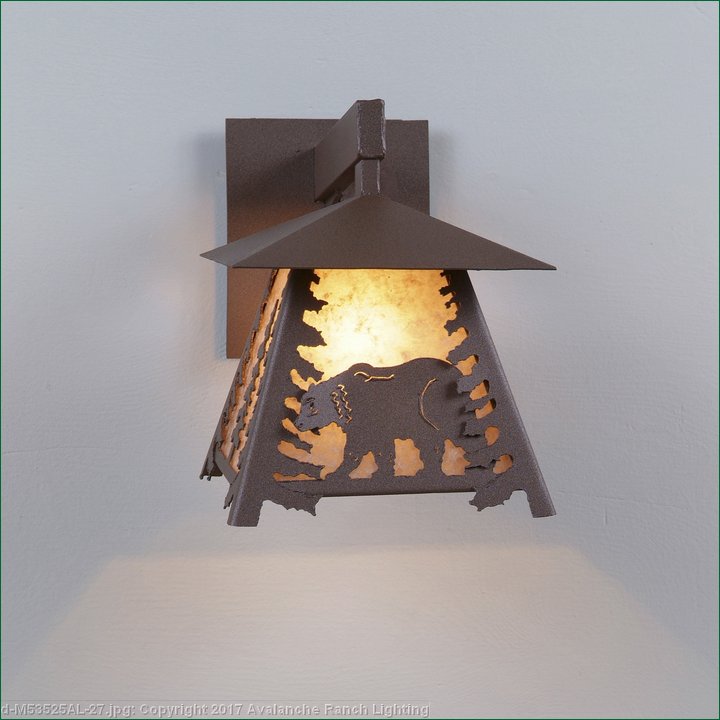 The Smoky Mtn Sconce Small - Bear fixture is UL-rated for indoor and outdoor locations. A bear image is displayed on the two front panels, along with a single spruce tree on the side panels. The fixture has a steel frame, and comes with a diffuser material choice between Almond or Amber mica. The sconce is hardwire only, and attaches to the wall with a 4.5 inch square pan. This light will bring rustic character to any log home, cabin or northwood lodge-themed room.