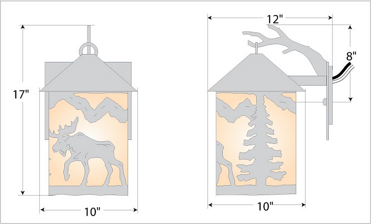 The Cascade Lantern Sconce Large - Mtn Moose features a steel branch holding up a 8 inch round cylinder with a cone top and a shade diffuser choice of color between Almond or Amber mica. Our exclusive moose metal art is on the front and spruce trees are on either side of the cylinder. Attaches to wall with a 4.5 inch square pan. Hardwire only. Suitable for interior and exterior locations. This rustic wall light is ideal for bringing rustic lighting to any log home, cabin or northwood-themed room.