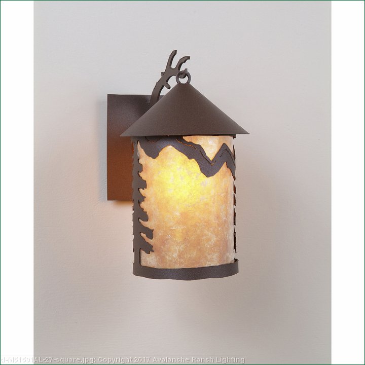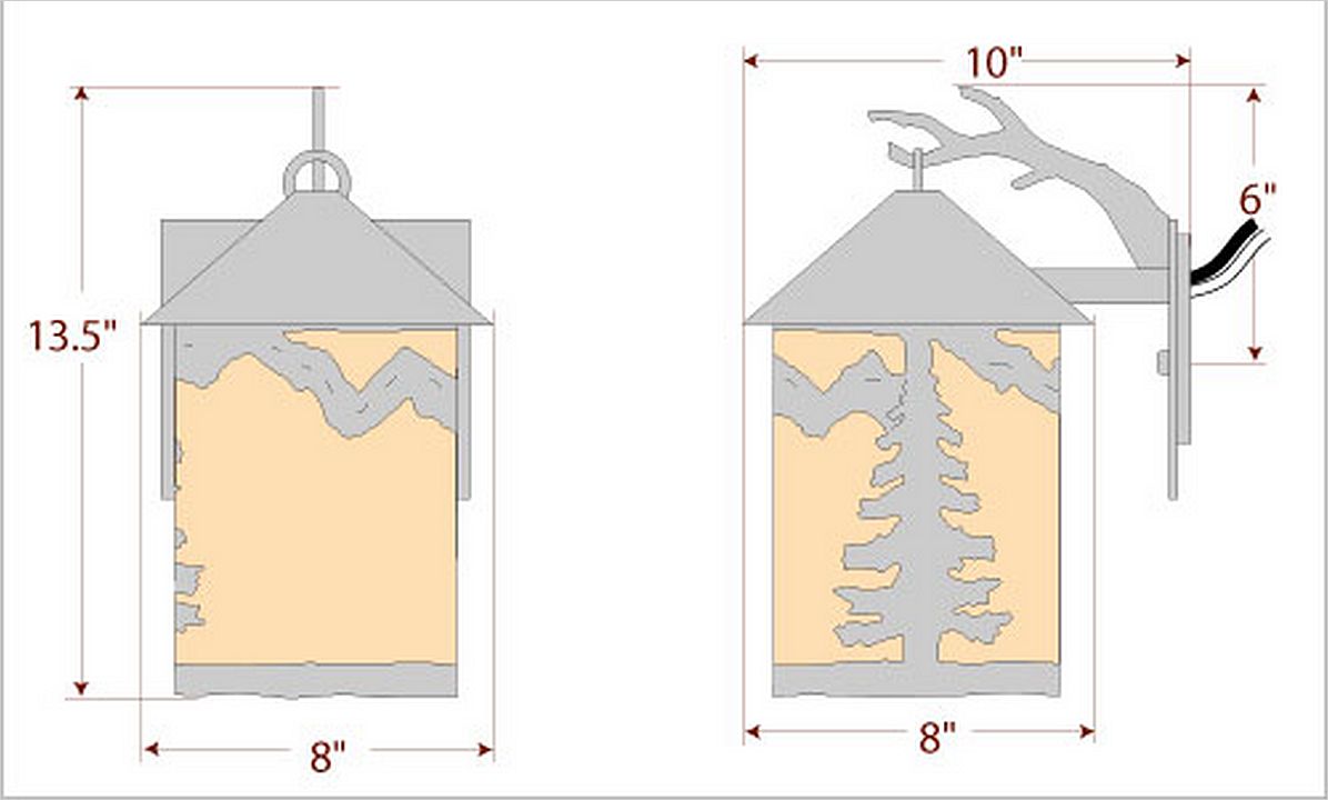 The Cascade Lantern Sconce Medium - Rustic Plain features a steel branch holding up a 6 inch round cylinder with a cone top and a shade diffuser choice of color between Almond or Amber mica. Mountains are on the front and spruce trees are on either side of the cylinder. Attaches to wall with a 4.5 inch square pan. Hardwire only. Suitable for interior and exterior locations. This rustic wall light is ideal for bringing rustic lighting to any log home, cabin or northwood-themed room.