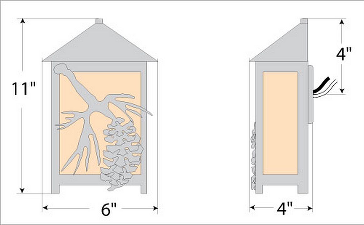 The Hudson Small Sconce - Spruce Cone features a three-dimensional cone with needles. It has a single lightbulb pointing down behind mica panels on three sides and a 5 inch square backplate, which can be mounted directly to an exterior wall or attached to a square wooden block. Diffuser material choice between Almond or Amber mica It is ADA compliant. Specify DP when order for the deep mounting pan option. UL approved for wet locations. Formerly known as the Sehome. This light will bring rustic lighting to the exterior of any log home or cabin.