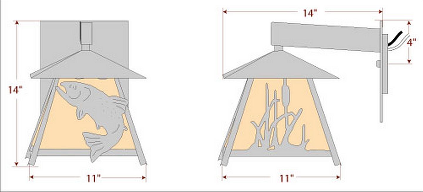 The Smoky Mtn Sconce Large - Trout fixture is UL-rated for indoor and outdoor locations. A trout image is displayed on the two front panels, along with cattail images on the side panels. The fixture has a steel frame, and comes with a diffuser material choice between Almond or Amber mica. The sconce is hardwire only, and attaches to the wall with a 4.5 inch square pan. This light will bring rustic character to any log home, cabin or northwood lodge-themed room.