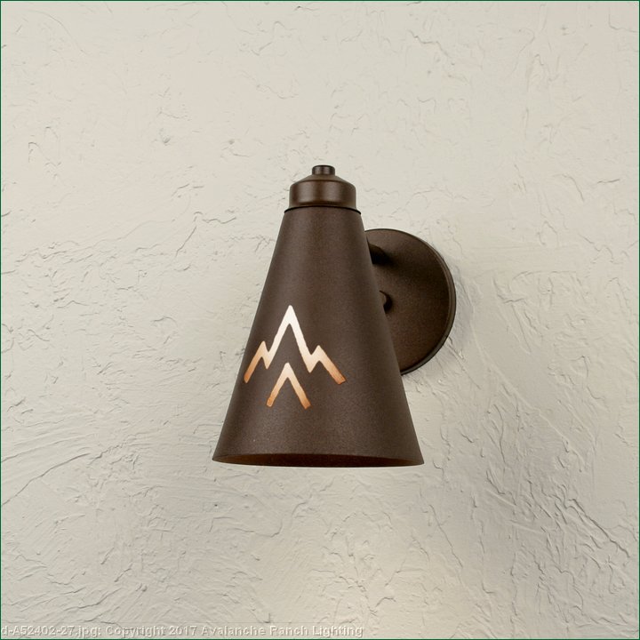The Canyon Sconce Small - Deception Pass features mountain cutouts on the front of the cone and meets the standards set by the International Dark-Sky Association, which seeks to eliminate glare and upward light. The light is directed downward. Mounts to a minimum 5 inch square board. Hardwire only. Note: Only powdercoated finishes are recommended for exterior locations.