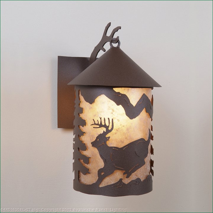 The Cascade Lantern Sconce Large - Mtn Deer features a steel branch holding up a 8 inch round cylinder with a cone top and a shade diffuser choice of color between Almond or Amber mica. Our exclusive deer metal art is on the front and spruce trees are on either side of the cylinder. Attaches to wall with a 4.5 inch square pan. Hardwire only. Suitable for interior and exterior locations. This rustic wall light is ideal for bringing rustic lighting to any log home, cabin or northwood-themed room.