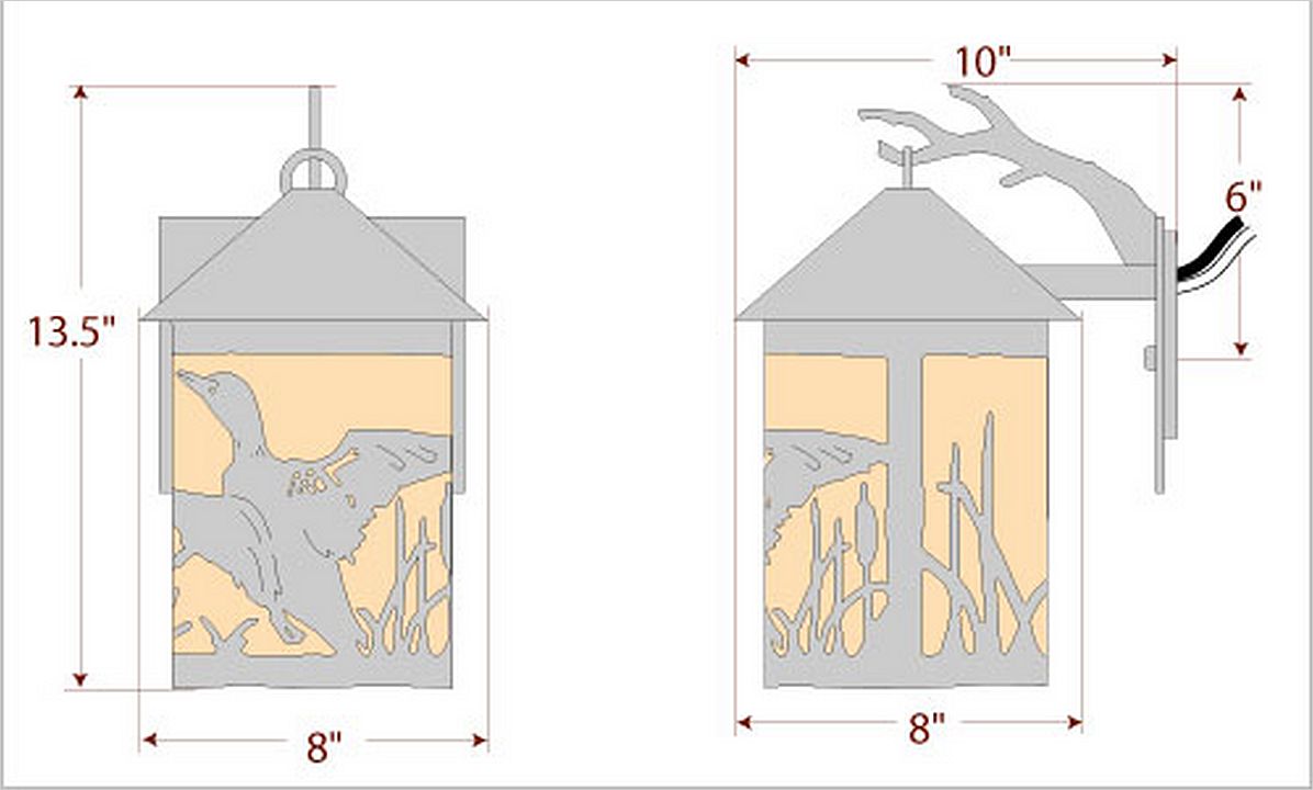 The Cascade Lantern Sconce Medium - Loon features a steel branch holding up a 6 inch round cylinder with a cone top and a shade diffuser choice of color between Almond or Amber mica. Our exclusive loon and cattails metal art is on the front and solid bands are on either side of the cylinder. Attaches to wall with a 4.5 inch square pan. Hardwire only. Suitable for interior and exterior locations. This rustic wall light is ideal for bringing rustic lighting to any log home, cabin or northwood-themed room.