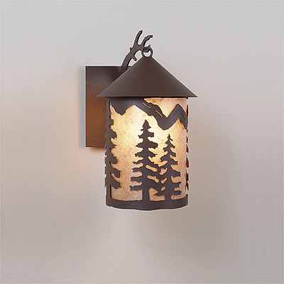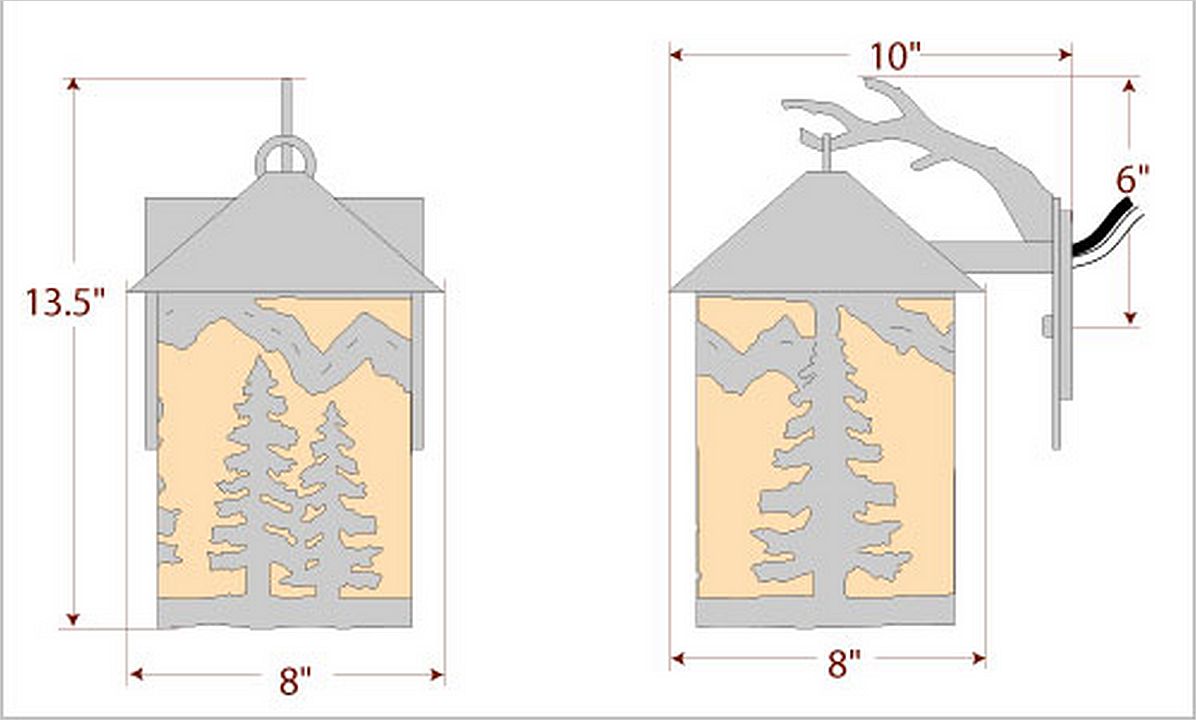 The Cascade Lantern Sconce Medium - Spruce Tree features a steel branch holding up a 6 inch round cylinder with a cone top and a shade diffuser choice of color between Almond or Amber mica. Our exclusive twin spruce metal art is on the front and spruce trees are on either side of the cylinder. Attaches to wall with a 4.5 inch square pan. Hardwire only. Suitable for interior and exterior locations. This rustic wall light is ideal for bringing rustic lighting to any log home, cabin or northwood-themed room.
