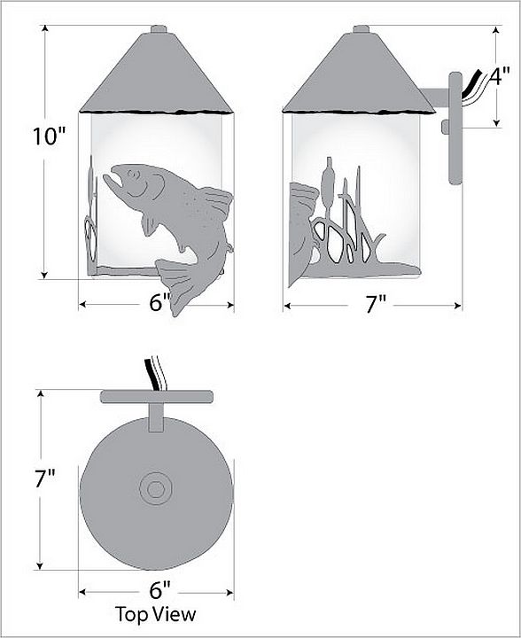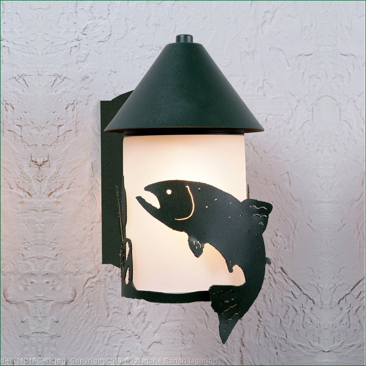 The Cedarline Sconce - Trout sconce is suitable for outdoor and indoor locations and features a frosted white glass cylinder with a trout image on the front and cattails on each side. This light is ideal for anyone wanting to add rustic lighting to the exterior of their log home or cabin.