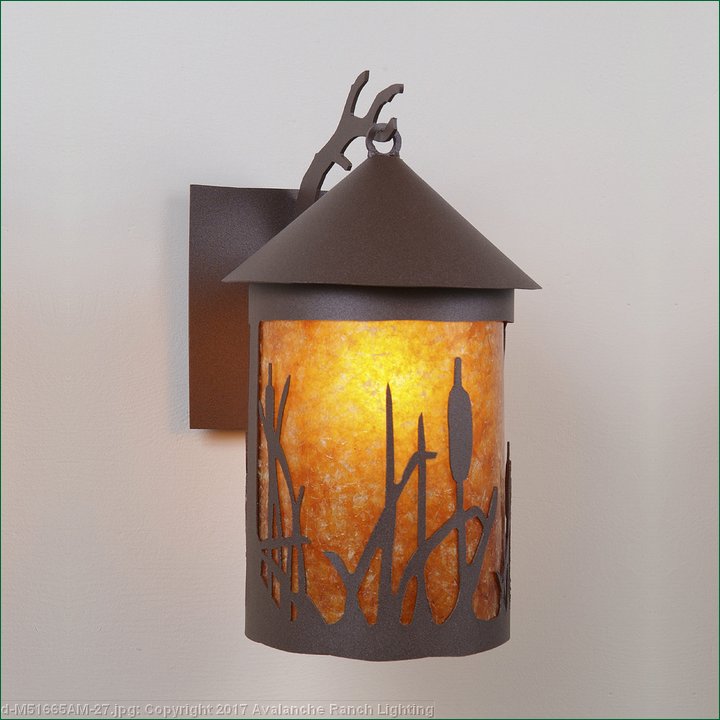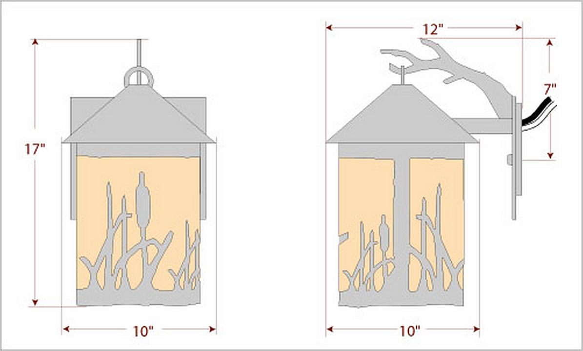 The Cascade Lantern Sconce Large - Cattails features a steel branch holding up a 8 inch round cylinder with a cone top and a shade diffuser choice of color between Almond or Amber mica. Our exclusive cattails metal art is on the front and solid bands are on either side of the cylinder. Attaches to wall with a 4.5 inch square pan. Hardwire only. Suitable for interior and exterior locations. This rustic wall light is ideal for bringing rustic lighting to any log home, cabin or northwood-themed room.