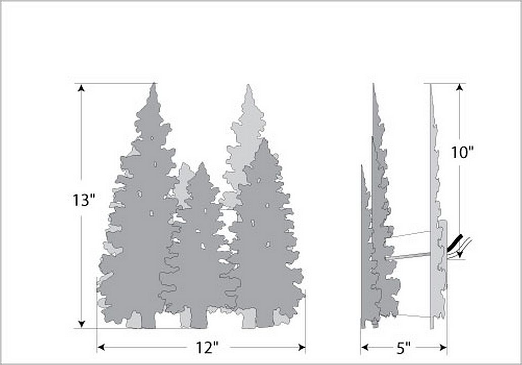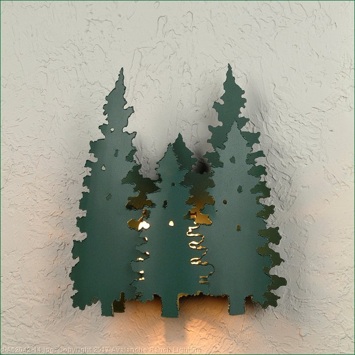 The Pine Grove Exterior Sconce features three steel pine trees set in front and behind the lighting. It is UL approved for wet locations. This item comes with a frosted glass cylinder which covers the bulb. The light source points downward. This rustic light is ideal for anyone looking to bring a touch of warm, rustic character to the outside lighting of their log home, cabin or northwood lodge-themed room. Mounts to a minimum 5 inch square board. Available only in powder-coated finish options.