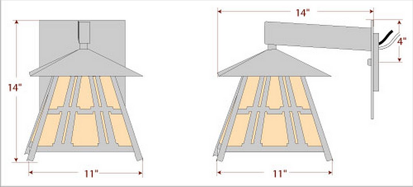 The Smoky Mtn Sconce Large - Eastlake fixture is UL-rated for indoor and outdoor locations. Our exclusive mission-style artwork is displayed on all four panels. The fixture has a steel frame, and comes with a diffuser material choice between Almond or Amber mica. The sconce is hardwire only, and attaches to the wall with a 4.5 inch square pan. This craftsman-styled sconce will bring warm lighting and character to any cottage, home, or mission-styled room.